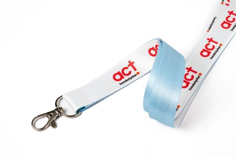 Vita nyckelband med nickelfri karbinhake och med Act Svenska kyrkans logotyp i färg på ena sidan och ljusblå baksida på bandet. Säkerhetsspänne i nacken. Tyget i bandet är tillverkat av återvunnen PET sk RPET. 20 mm brett, 900 mm långt. Använd nyckelbandet vid insamlingsaktiviteter. Det är en uppskattad "giveaway".