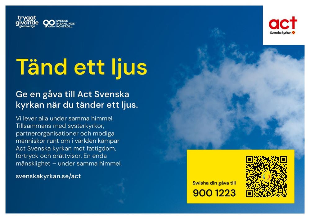 Skylten är enkel att placera vid ljusbäraren och hjälper till att synliggöra möjligheten att stödja Act Svenska kyrkans arbete. Finns även som nedladdningsbar PDF.